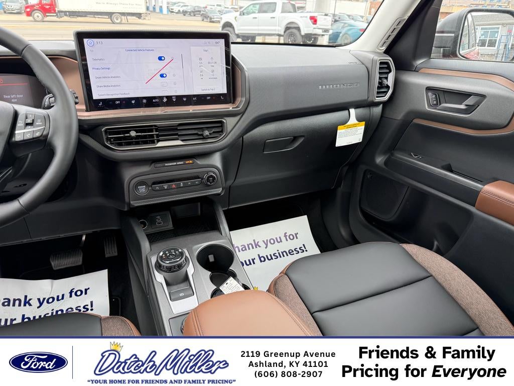 2026 Ford Bronco Sport Outer Banks 4WD — Ashland KY — Best Price Ready for Kentucky roads and weekend adventures, this 2026 Ford Bronco Sport Outer Banks in Ashland KY pairs rugged capability with refined comfort. Powered by an efficient 3-cylinder 1.5L gasoline engine and equipped with confident 4WD, this Ford Bronco Sport delivers capable handling whether you're navigating city streets or dirt trails. Features you'll appreciate include premium leather seats and a heated steering wheel for cold mornings, plus an advanced navigation system to keep you on course. Parking is simple with rear parking sensors and a back-up camera for added safety and convenience. The Outer Banks trim balances off-road readiness with upscale touches, making this Ford Bronco Sport a versatile daily driver and weekend companion. This vehicle is competitively priced and listed as the best price in the area — great value for an Outer Banks-branded Ford Bronco Sport with these amenities and 4WD. Located in Ashland KY, it's easy to test drive and experience the comfort and capability firsthand. Ideal for buyers seeking a compact SUV with distinctive style, modern tech, and practical features. Contact us to schedule a test drive or to get more details on financing and availability. Don't miss this opportunity to own a well-equipped 2026 Ford Bronco Sport Outer Banks at the best price in Ashland KY.