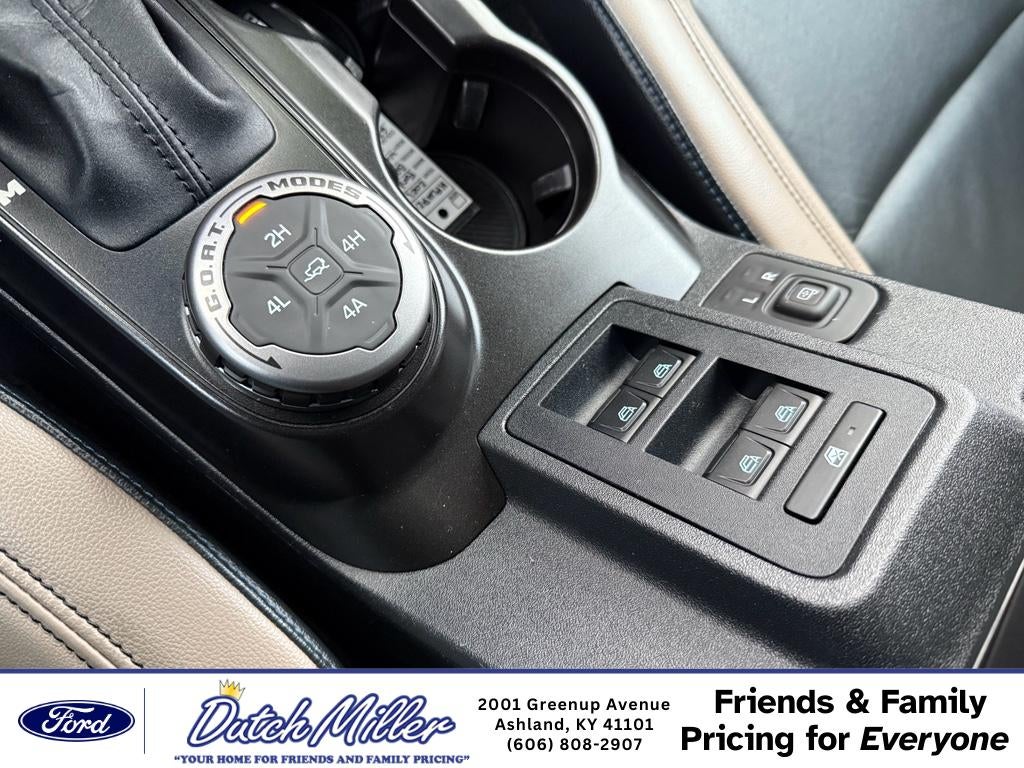 Equipment Group 354A Lux Package: 17" Black High Gloss-Painted Aluminum Wheels; 4.7 Axle Ratio; Connected Built-In Navigation; 2 Smart Charging USB Ports in Dashboard; 12" LCD Capacitive Touchscreen with Swipe Capability; Evasive Steering Assist; Heated Steering Wheel; 6. 160 lbs GVWR; Adaptive Cruise Control; Additional Sound Deadening; Information on Demand Panel; Wireless Charging Pad; B&O Sound System by Bang and Olufsen; .2.7L ECOBOOST V6 ENGINE; Forward Sensing System; .10-SPEED AUTO TRANSMISSION; 360-Degree Camera; LT315/70R17 Mud-Terrain Tires; Universal Garage Door Opener; Sideview Mirrors. Heated Leather-Trimmed/vinyl Bucket Seats. Ford Performance Heavy-Duty Modular Front Bumper. Connected Built-In Navigation. Wildtrak Bodyside Graphic. Powder Coated Tube Step. Front Row Top Panels and Door Storage Bags. **Equipment listed is based on original vehicle build and subject to change. Please confirm the accuracy of the included equipment by calling the dealer prior to purchase.**